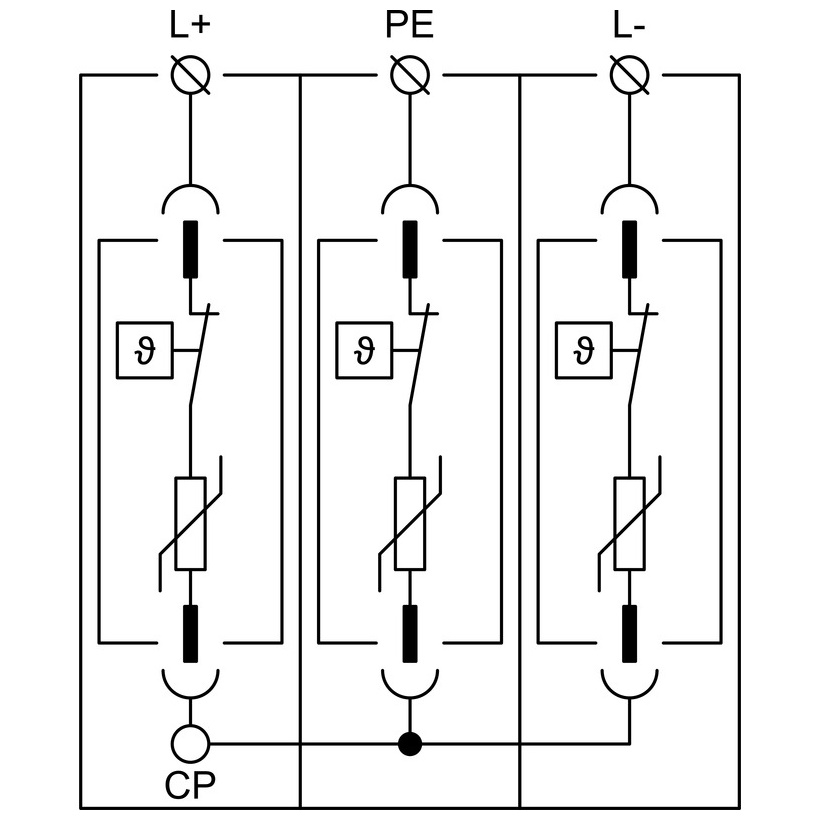 এল+, এল– এবং পিই এর মধ্যে প্রতিটি ভেরিস্টর সেক্টর একটি অভ্যন্তরীণ তাপ সংযোগকারী দ্বারা সজ্জিত। ভারিস্টর এন্ড-অফ-লাইফ (অতিরিক্ত উত্তাপ) এ, সংযোগ বিচ্ছিন্নকারী ডিসি কারেন্টকে বাধা দিতে এবং সুস্পষ্ট ত্রুটি ইঙ্গিত দেওয়ার জন্য ট্রিপ করে। বিশেষ সংযোগকারী নির্মাণ পৃথক ব্যাক-আপ ফিউজ ছাড়াই ইনস্টলেশন সক্ষম করে, সমন্বয়কে সহজ করে এবং স্থান সংরক্ষণের স্থান।